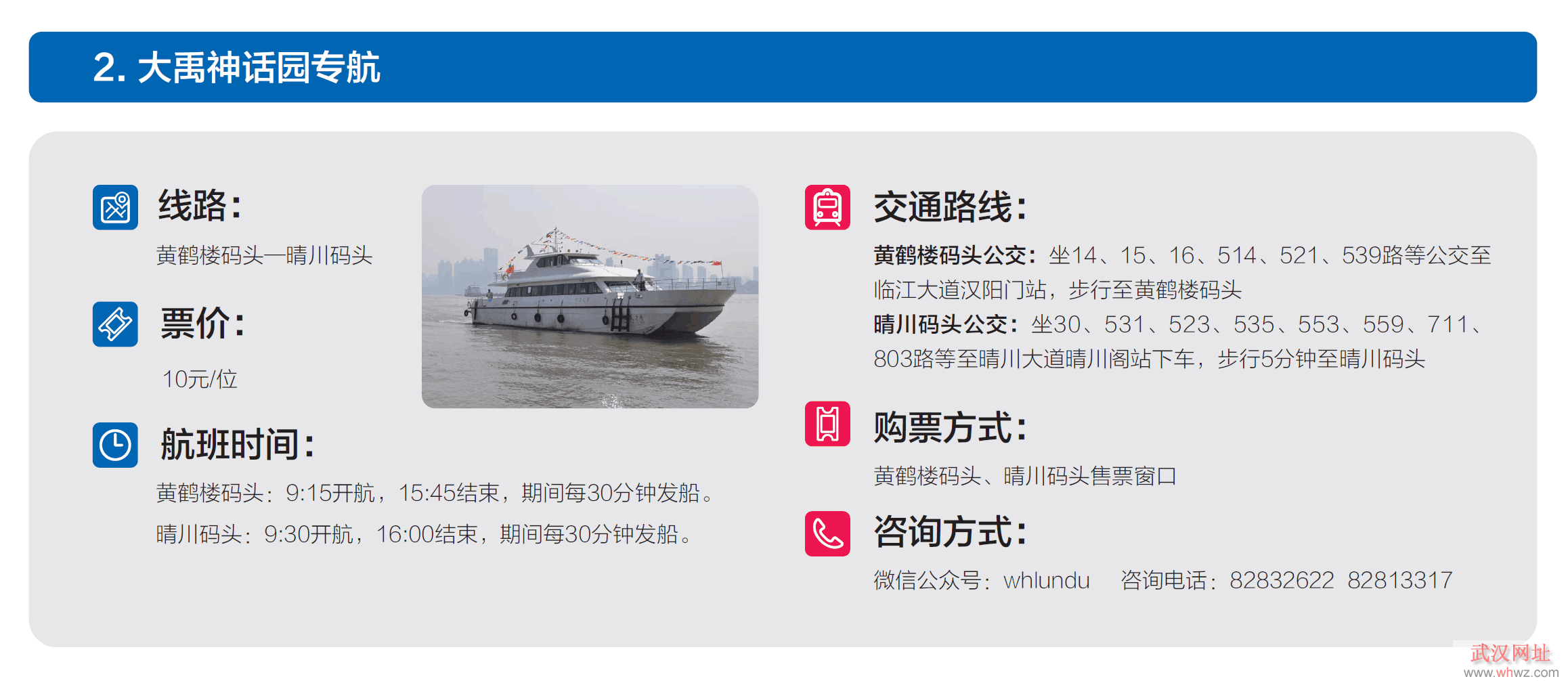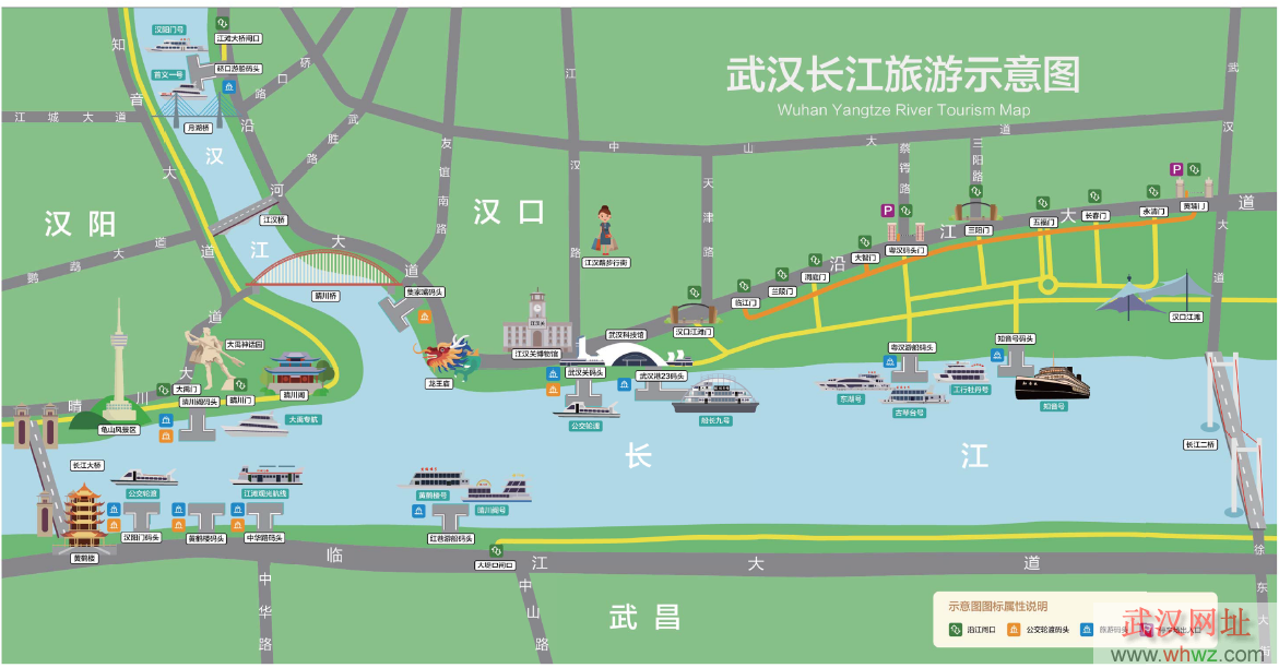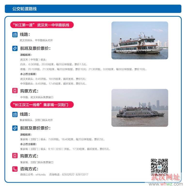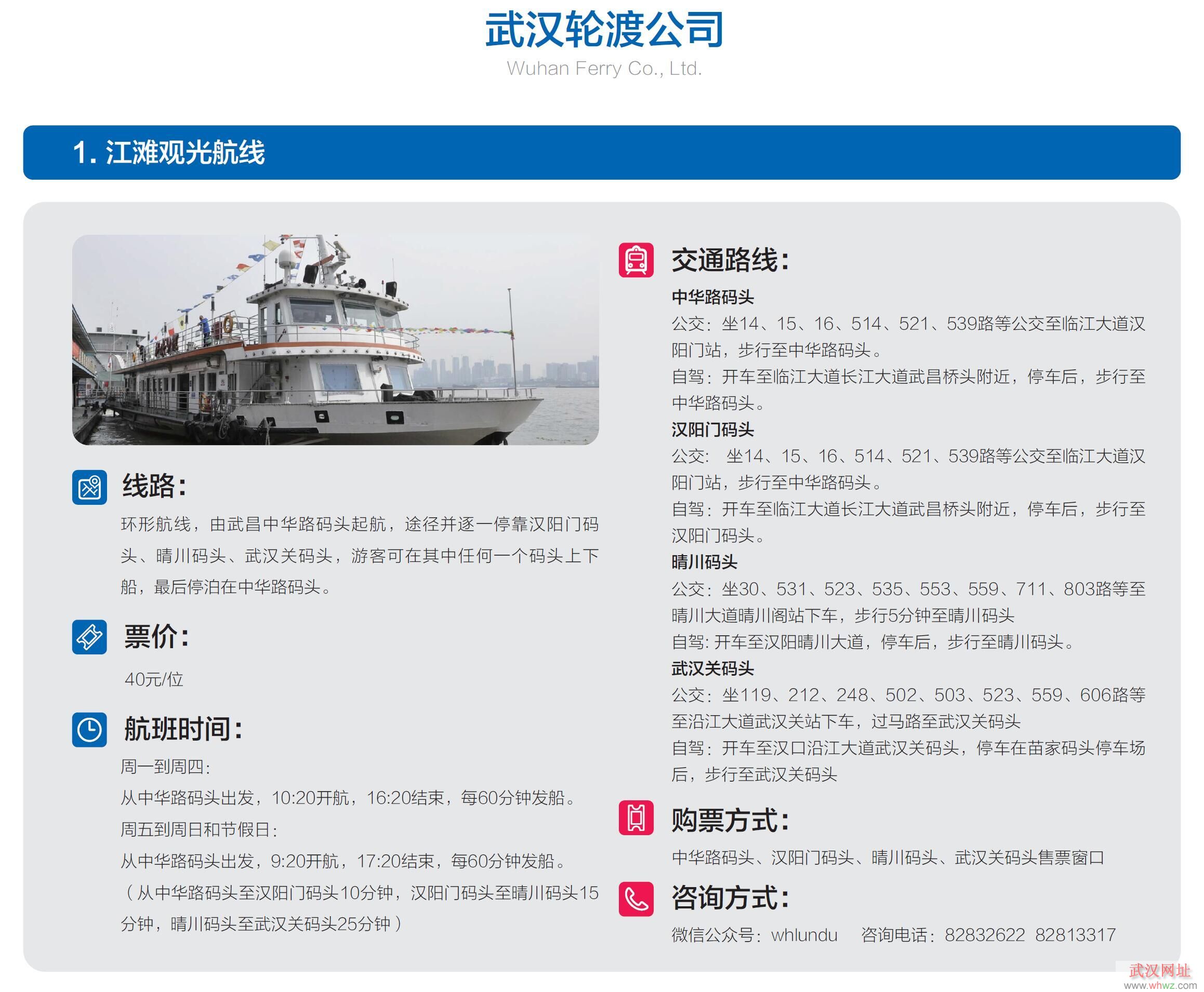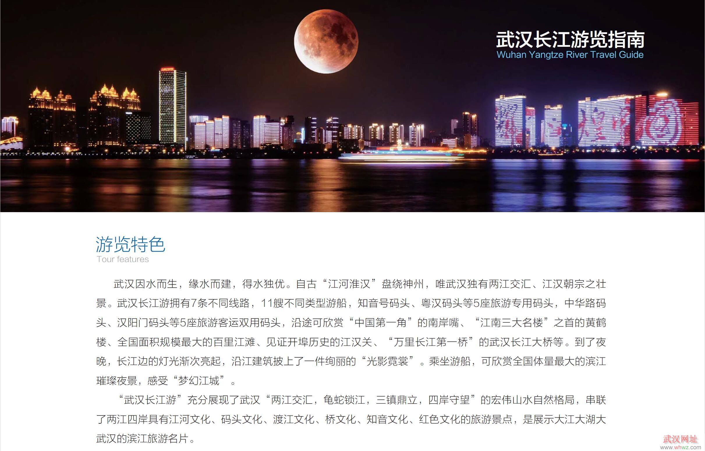2005年,百年企業武漢市輪渡公司購置“晴川閣”號游船成為武漢市第一家從事長江游覽的運營公司,隨著長江游覽行業不斷發展擴大,至今武漢從事長江游覽的運營公司已有4家,2017年接待游客約70萬人次。2018年8月27日,武漢市旅游委發布《武漢長江游覽指南》,武漢市輪渡公司11條航線中有7條兼具客運和旅游功能的航線名列其中。 為方便前來領略江城長江之美的游客,現將《武漢長江游覽指南》部分內容截圖如下,以供參考。