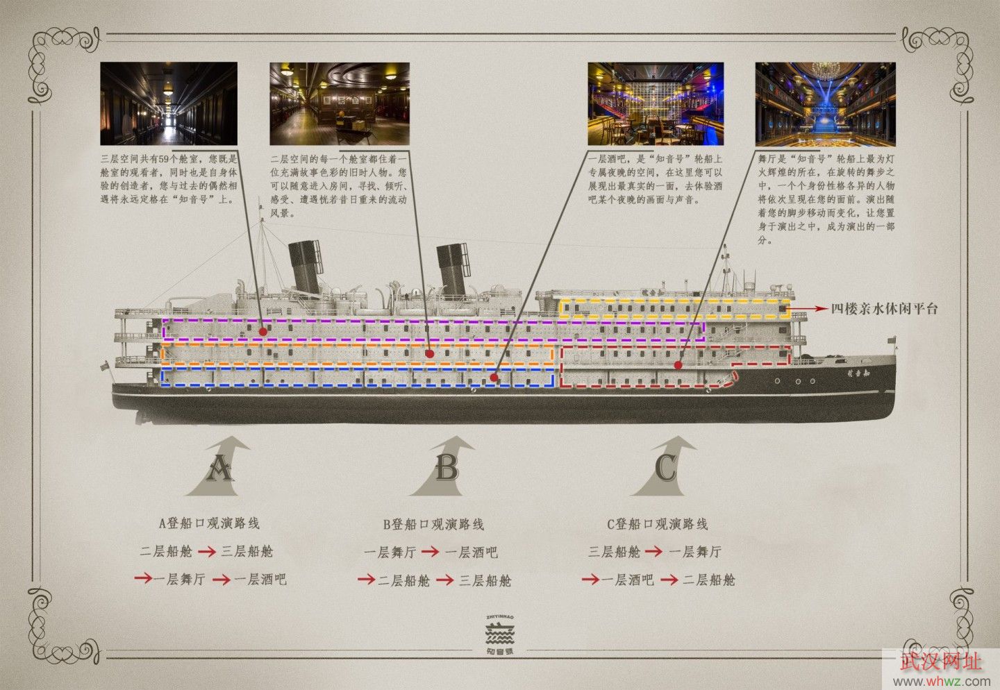 為使游客有更好的觀演體驗,《知音號》分為A、B、C三個登船口進入“知音號”內(nèi),三條路線入口和路線不同但觀看內(nèi)容是相同的。