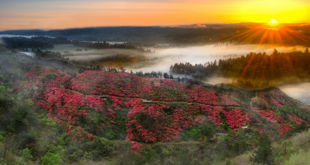 云霧山原名礦山,是武漢市最大的城市郊野公園,方圓25平方公里,主峰海拔709米,屬武漢市最高峰。木蘭云霧山為木蘭八景之一,國家5A級旅游景區。“十里花山,八里柳溪,一山兩教,四季香火”, 尤其是進入四月,聽到的都是呢喃鳥語,聞到的是花草馨香,漫山遍野,目力所及之處,無一不是杜鵑花的世界,杜鵑花的海洋。